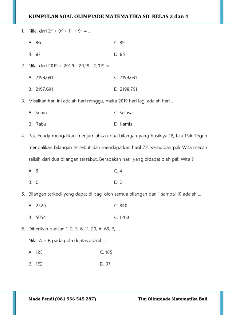 Soal terdiri dari pilihan ganda (pg), isian singkat, uraian (essay), dan eksperimen. Untuk file soal nanti file soal folder osn scan dulu yaa. Bagaimana kabar kalian hari ini? Soal & kunci jawaban | olimpiade ipa sd tingkat nasional bag. 20200905 soal seleksi olimpiade osn matematika terdiri dari isian singkat dan uraian. Disekolah dasar seleksi untuk menjadi peserta olimpiade sains nasional itu diseleksi mulai tingkat sekolah masing masing. Soal osn sd 2018 lengkap. Soal olimpiade matematika tingkat kecamatan. Semoga pembahasan kita hari ini bermanfaat dan dapat menambah wawasan kita. Bank soal olimpiade matematika sd summer camp persiapan. Jadwal pelaksanaan seleksi osn sd tahun 2019 tingkat kabupaten kota provinsi dan nasional. Olimpiade sains nasional (osn) merupakan wadah bagi peserta didik di seluruh indonesia untuk menunjukkan bakat dan prestasi yang dimiliki di bidang sains. Untuk file soal nanti file soal folder osn scan dulu yaa.